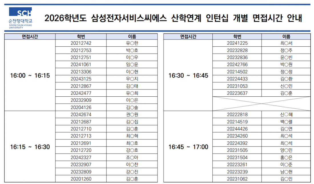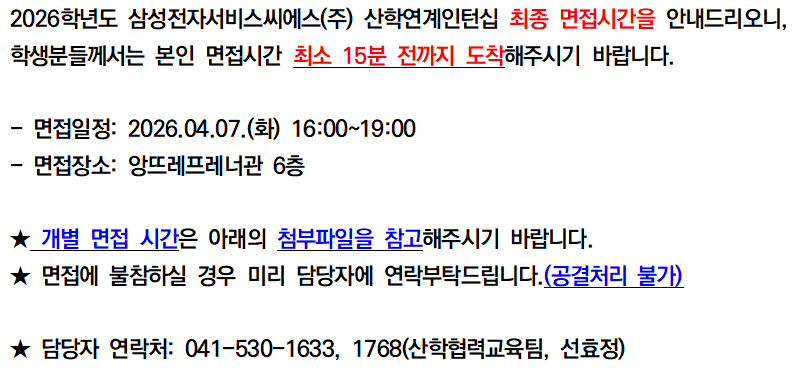 2026학년도 삼성전자서비스씨에스(주) 산학연계 인턴십 면접일정 안내(최종안내)